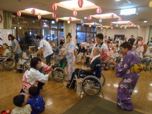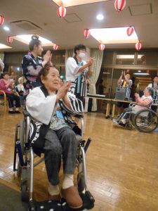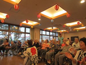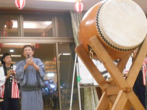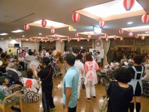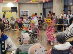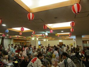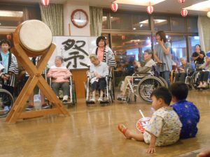 今年は猛暑であった為、室内で行いました。外での祭りの雰囲気を味わって頂きたいという思いもありましたが、