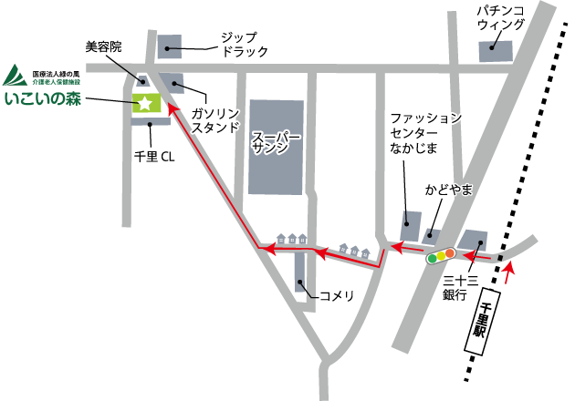 三十三銀行→信号→かまどや→(左に曲がる)→(すぐに右に曲がる)→コメリ→(突当り右に直進)→いこいの森
