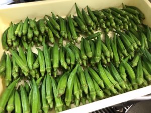 写真は夏の野菜のオクラと冬の野菜の春菊です。生の野菜にこだわって普段から季節に合った食材を提供しています。