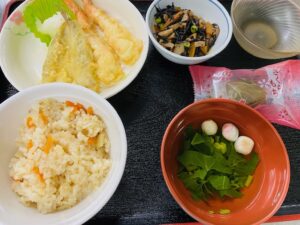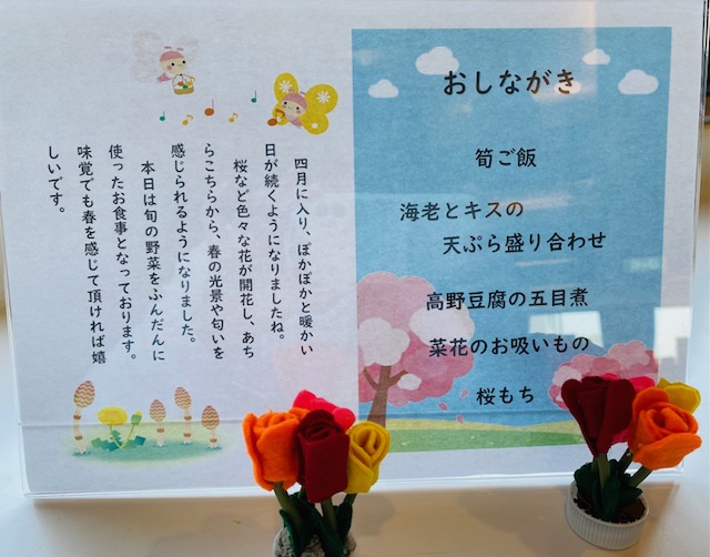 竹の子ごはんに天ぷら、桜餅の献立は皆様に喜んでいただきました。