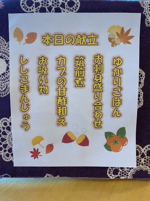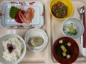 11月の特別献立は、ゆかりご飯、刺身の盛り合わせ、筑前煮、お吸い物、かぶの甘酢和え、ししこ饅頭です。