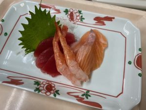 らくらく食には薄くカットしたまぐろとサーモン、甘エビを提供しました。特らくらく食にはネギトロと甘エビを提供しました。皆様にも好評でした。