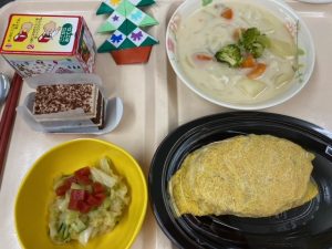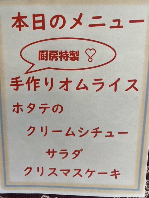 12月の特別献立は、オムライス・ホタテのクリームシチュー・サラダ・クリスマスケーキです。