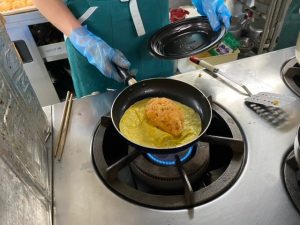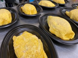 目玉メニューは厨房手作りのオムライスです!ケチャップソースとデミグラスソースの二種類から選べるようにしました。卵も一枚ずつ焼いて手作業で包みました。