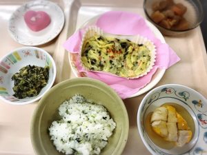 今回特別献立は、菜飯、グラタン、大根の味噌煮、れんこん蒸しの生姜あんかけ、青菜和えです。