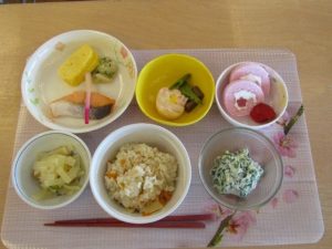 4月の特別献立は、筍ご飯、鮭の塩焼き、春の盛合わせ、大根の炒め煮、菜花の白和えです。