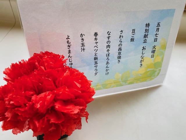 カーネーション飾りは本館デイご利用者の方々が作ってくださったものです。
