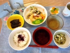 6月の特別献立は、ゆかりご飯・天ぷらの盛り合わせ・赤だし・茄子の田舎煮山椒風味・酢の物・手作りパンナコッタ。