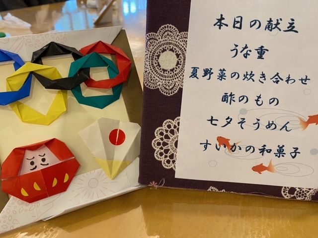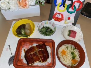 今月の特別献立は、うな丼・夏の炊き合わせ・七夕そうめん・酢の物・スイカの練切になります。