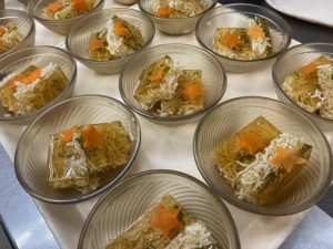 そうめんは星形の人参を乗せて七夕をイメージしています。らくらく食の方は汁と一緒に固めてそうめんゼリーにしました。