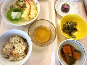 メニューは、炊き込みご飯・海老の天ぷらとかき揚げ・南瓜の生姜煮・茄子の中華和え・水まんじゅう、となります。