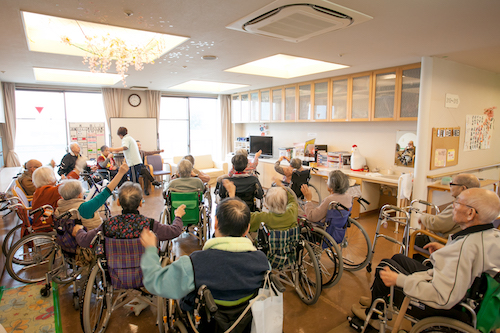 毎週火曜日と金曜日(または土曜日)に音楽療法士による音楽療法があります(利用者が受けられるのは基本的には週1回)。音楽には不思議な力が秘められています。この力を最大限に利用して、心身ともに健康に導いていくことを音楽療法と言います。カラオケの機械とは違い、音楽療法士が利用者に合わせて、伴奏を奏でますので安心して歌えます。昔懐かしい歌を口ずさむことで楽しい気持ちになったり、当時を振り返って会話をすることで、脳の活性化にも繋がったりもします。また聞いたり歌ったりするだけでなく、簡単な楽器をいっしょに鳴らすことで体のリハビリにもなります。