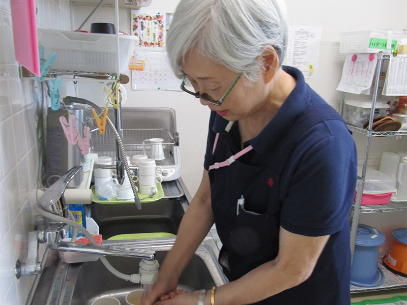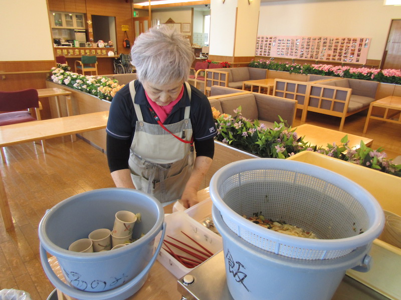 当施設では、60歳~75歳くらいの元気高齢者を介護助手として積極的に採用しています。今まで介護士がしていた、掃除や食事の片づけなどの作業をして頂くことで、介護士は本来の介護業務に専念することができます。介護助手として働く事で、自立支援に向けた介護を学びながら、自分自身の体力維持・認知症の予防にもつながり、地域社会に貢献する事ができます。