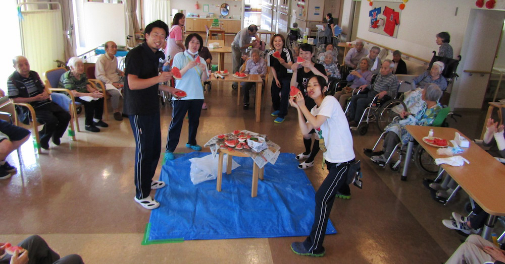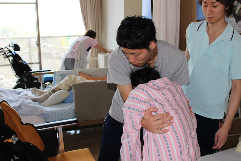 施設における介護職の業務内容は、利用者さんの生活に伴う身体介護(食事・排泄・入浴・整容・移乗・移動等)に加え、レクリエーションやリハビリテーションの実施等があります。更に、利用者さんお一人おひとりに合わせた『オーダーメイドの介護』を提供すべく、担当の介護職員が支援相談員やリハビリスタッフ等の他職種と連携してケアプランの立案を行っているのも当施設の特徴です。利用者さんやご家族が安心して在宅生活が送れるよう、チームケアの一員として利用者さんの生活をサポートさせていただきます。