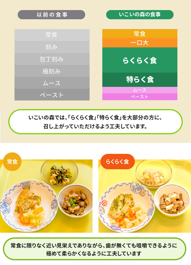 らくらく食:舌でつぶして口の中で飲み込みやすい形を作りやすい形態です。圧力鍋で調理します。 素材を選び、調理方法を工夫し、食塊形成をサポートする形態。マヨネーズ、ごま油等を使用 しています。見た目が常食と変わりません。ミキサーにかけたものを再形成したものではありません。増粘剤を使わずに食材をそのまま使用しています。